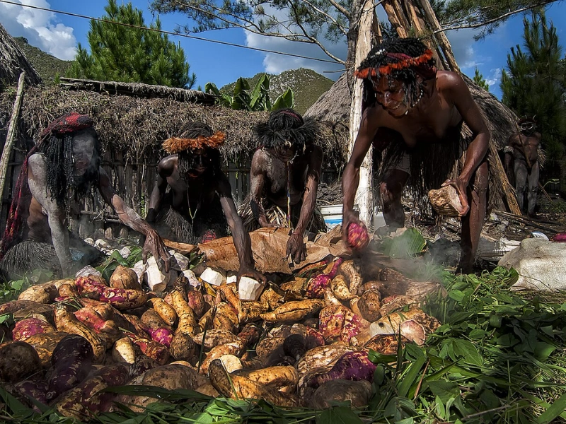 Setelah matang, semua anggota suku berkumpul di lapangan tengah kampung untuk membagi makanan dan menikmatinya bersama, menegaskan nilai kebersamaan dan solidaritas.