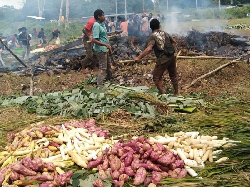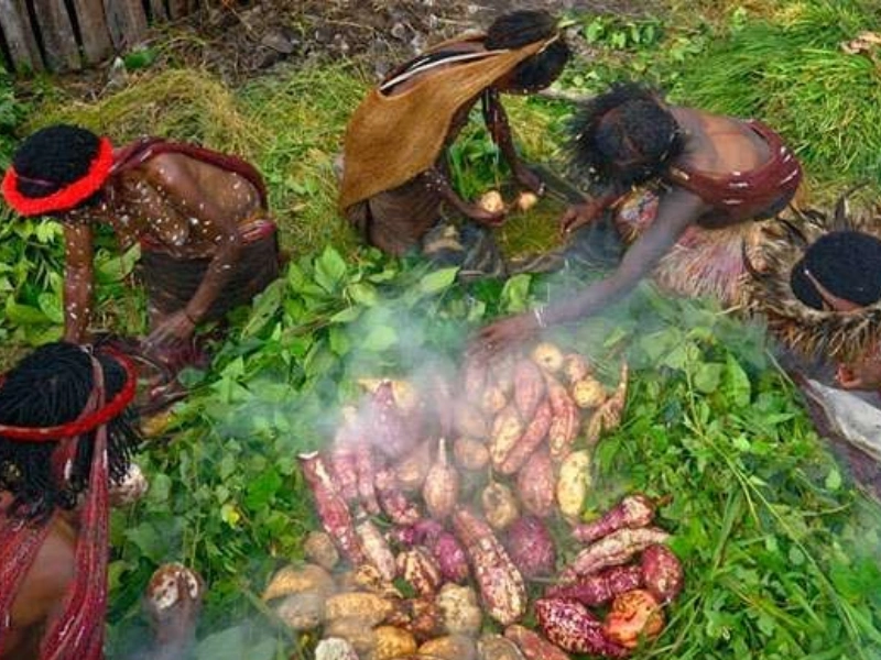 - Ubi jalar, singkong, dan sayuran lain ditutup dengan daun, ditumpuk batu panas lagi, dan ditutup daun pisang serta alang-alang.