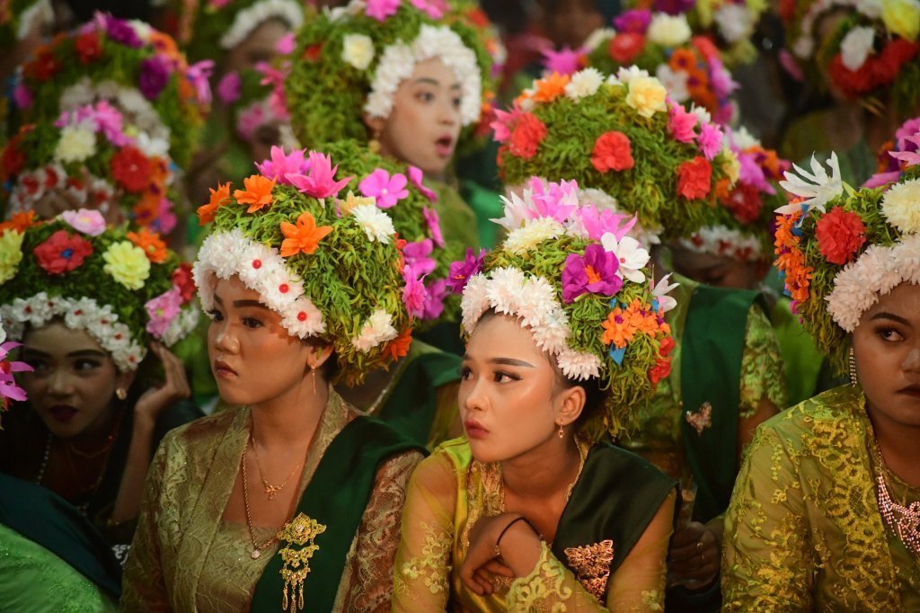 - Busana tradisional: melambangkan kesucian, kesopanan, dan kesiapan moral.