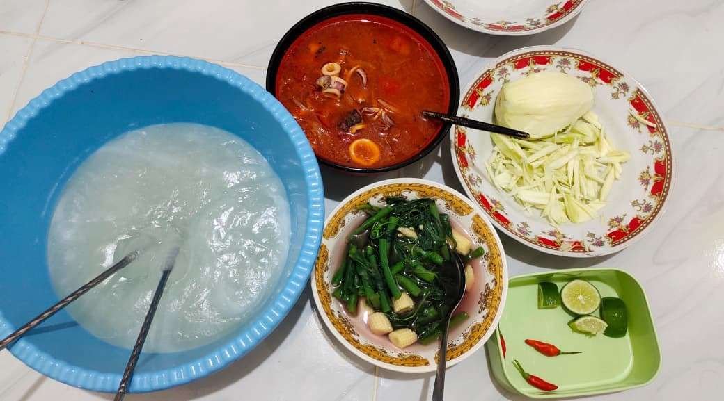- Penyaji menyajikan sinonggi bersama kuah ikan, sayur, dan sambal khas.
