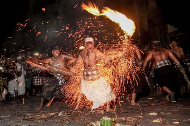 Di tengah gelapnya malam, bara api dari sabut kelapa beterbangan ketika para krama desa saling berhadapan. Suasana dramatis tersebut menjadi simbol pembersihan diri dan lingkungan dari energi negatif, sekaligus wujud bakti kepada leluhur.